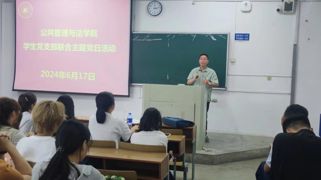 胡正友以“遵规守纪,青年党员扣紧第一粒扣子”为题,为全体党员讲授了纪律党课。他带领大家学习了习近平总书记关于党的纪律建设的重要论述,传达了中央党的建设工作领导小组会议和中共中央办公厅《通知》精神、校党委关于开展党纪学习教育的部署;介绍了学院党委和各党支部组织开展党纪学习教育的基本情况。他对《中国共产党纪律处分条例》进行了解读,要求全体党员以“学”纪为根本,切实成为遵规守纪的明白人。他强调,全体党员要深入“知”纪、自觉“明”纪、坚决“守”纪,守住红线、不碰高压线。他希望学生党员扣紧党纪“第一粒扣子”,从入党之初做起、从现在做起,持续加强党性锤炼,不断提高自身修养,时时警醒自我,始终做遵规守纪的合格党员。他要求在校学生党员始终做到政治自律、学习自律、生活自律,继续在日常学习、生活和工作中发挥先锋模范作用;他希望并祝愿全体毕业生党员始终严格要求自我,用好党纪“紧箍咒”“护身符”,在新的岗位、新的角色继续闪光发彩。