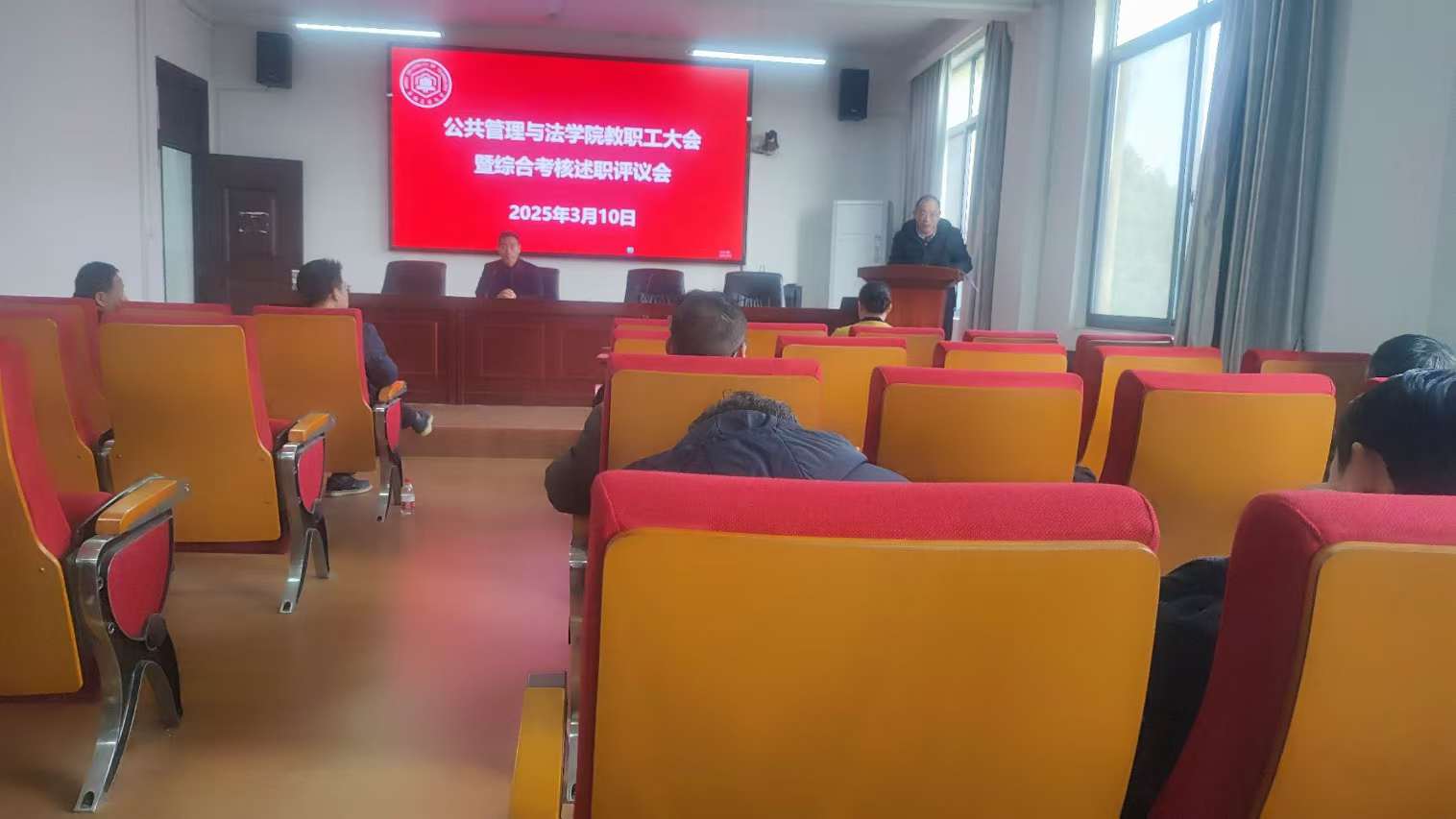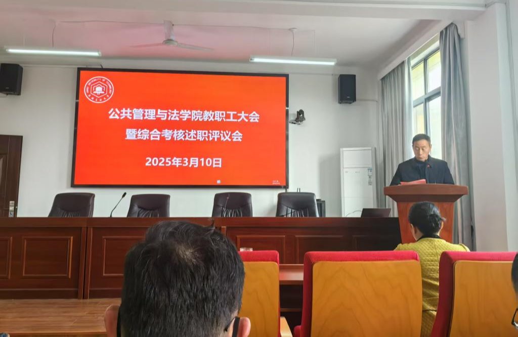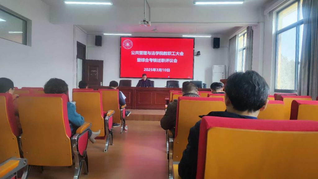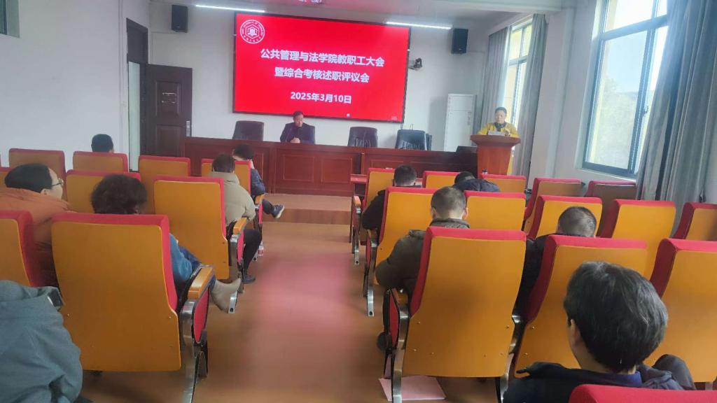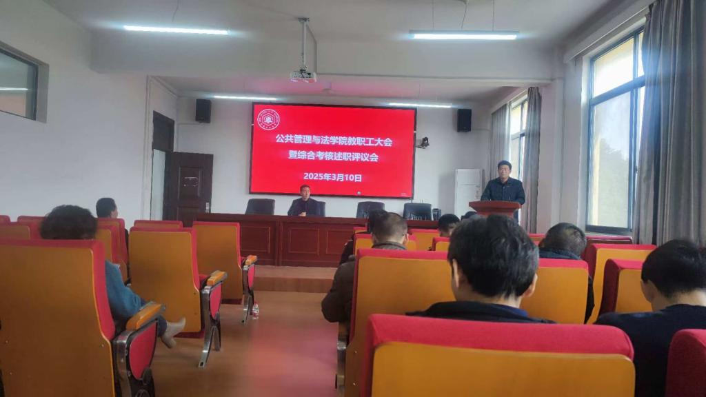 在学院301报告厅召开教职工大会暨综合考核述职测评会。全体教职工及学生代表参加会议。学院党委副书记、纪委书记、副院长周浩然主持会议。