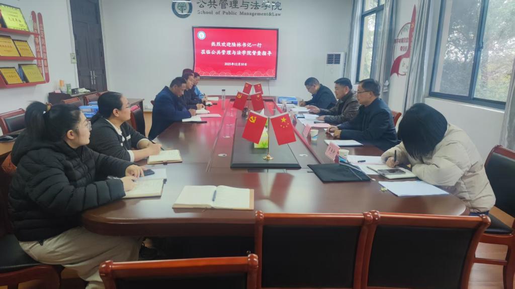12月10日下午,校党委党建督查第一督查组组长、校党委书记陆林带领督查组成员一行4人至公共管理与法学院督查指导学院2025年基层党建工作。学院领导班子成员、组织员、师生党支部书记代表参加督查汇报会。学院党委书记胡正友主持会议。