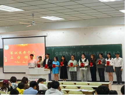 24级新生辅导员钱前上台发言,对圆满完成训练任务的24级全体新生表示祝贺,希望同学们以军训为起点,在今后的学习和生活中,继续保持军训中养成的良好习惯和优秀品质,严于律己,遵纪守法,做一个有纪律、有担当的人,不断提升自己的综合素质。军训优秀个人代表法242崔子怡同学上台分享了她的军训体验和心得体会。发言完毕,院党委副书记周浩然、辅导员钱前为在军训期间认真执训的教官颁发“优秀教官”证书,为在军训期间认真履行日常安全管理的军训助理、班级助理和军训联络员颁发聘书,并对军训期间表现突出的军训优秀个人、优秀宿舍进行表彰。