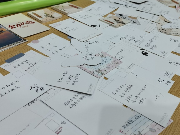 同学们在精致的明信片上写下对2024年的总结,并表达对新的一年的期许。一张张明信片承载着大家美好的祝福与期望。