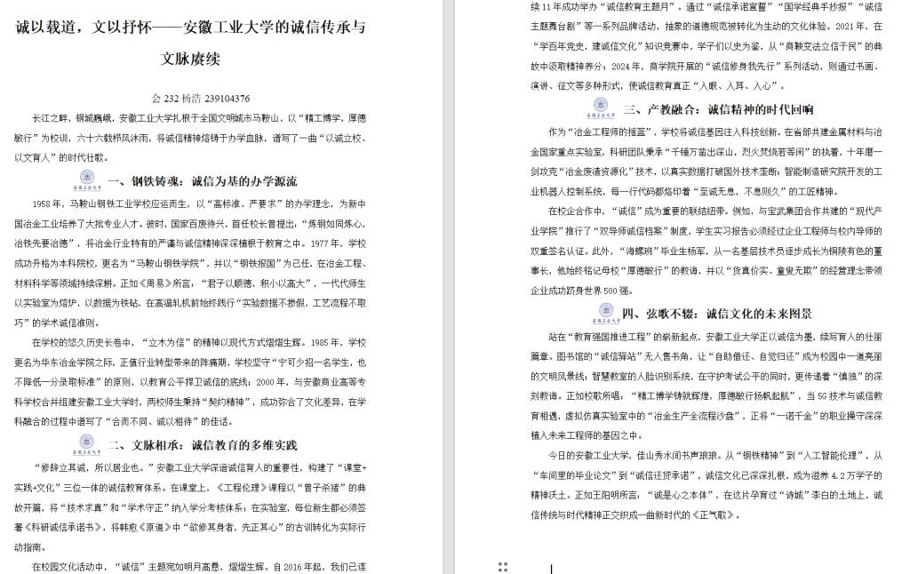 本次活动以“诚信”为核心主题,鼓励学生通过文学创作的形式,探讨诚信的价值与意义,抒发个人对诚信的感悟与思考。活动旨在通过文字的力量,深化学生对诚信的理解,倡导诚实守信的道德风尚,传承和弘扬中华优秀传统文化。“诚信不仅是个人立身之本,更是社会和谐发展的基石”。活动过程中,同学们饱含热情,以文字展现青年风采,传承诚信精神。将现实中的案例融入创作,真正做到学以致用并且领悟出诚信在个人成长、社会交往及职业发展中的重要作用。评委们以分组的形式进行评选工作,秉持公平公正的原则,评选出了数篇优秀征文。其中,会232杨浩、金222江林健、政241张莹的文章脱颖而出,参赛者用他们自己的笔触,展示了诚信的重要性以及现实生活中诚信与人们的紧密联系。