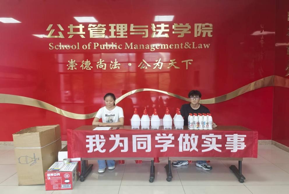 在公法楼前搭设摊点发放消毒物资)