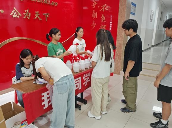 各年级同学自觉排队领取防护物资,学院为大家准备的喷壶与消毒水,既便于日常使用,又能有效帮助同学们对寝室和学习环境进行清洁消毒。发放过程中,志愿者们认真维持秩序,细心叮嘱领取的同学:“要定期喷洒消毒,保持空气流通”“做好防护不仅是保护自己,也是守护身边的人”。一句句贴心的话语,让同学们在领取物资的同时,也感受到来自学院的关怀与温暖。学院党委副书记、纪委书记、学工院长周浩然亲临现场,对同学们表达了殷切关心。周浩然叮嘱同学们要增强防护意识,科学合理使用消毒物资,养成健康生活习惯,并强调学院将一如既往把学生的安全和健康放在首位,全力为大家营造良好的学习生活环境。