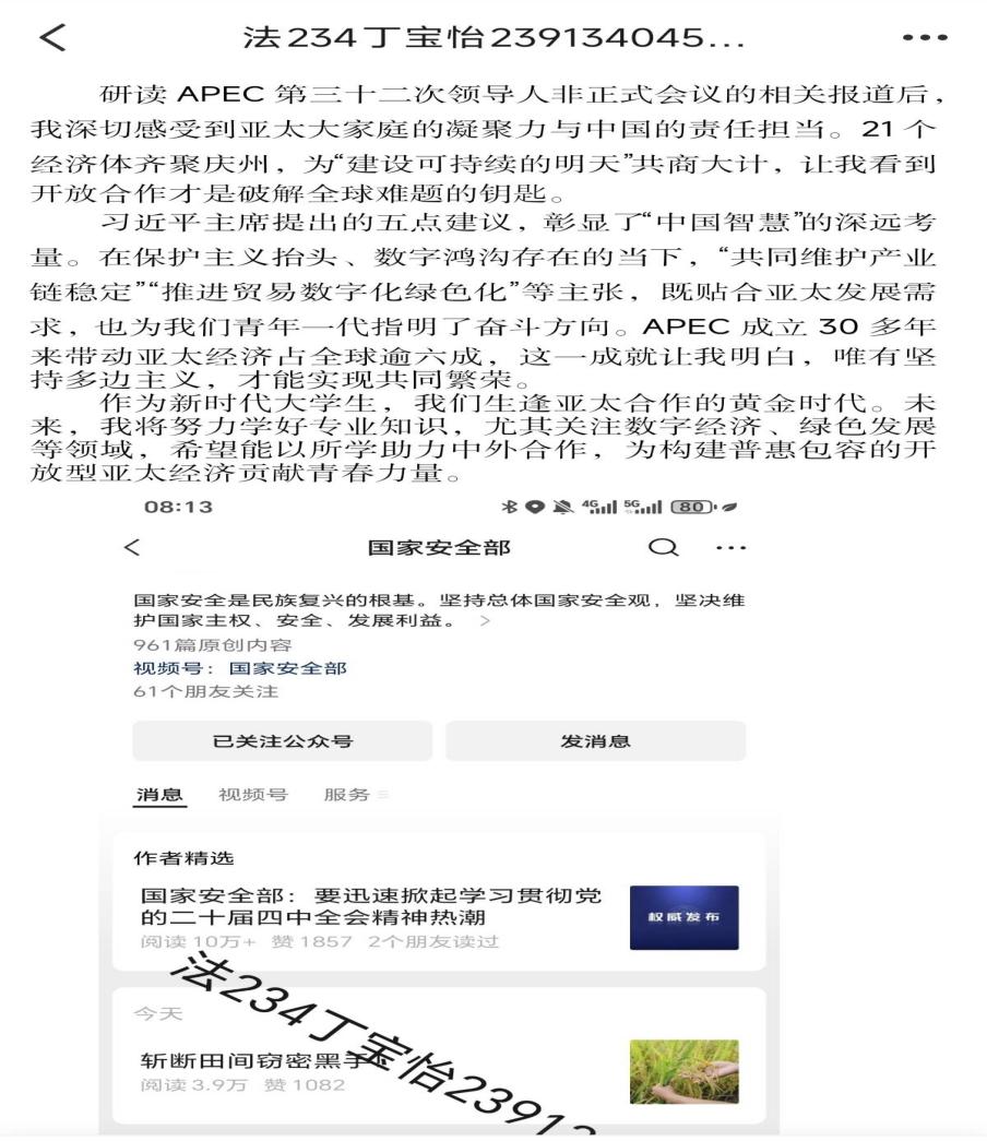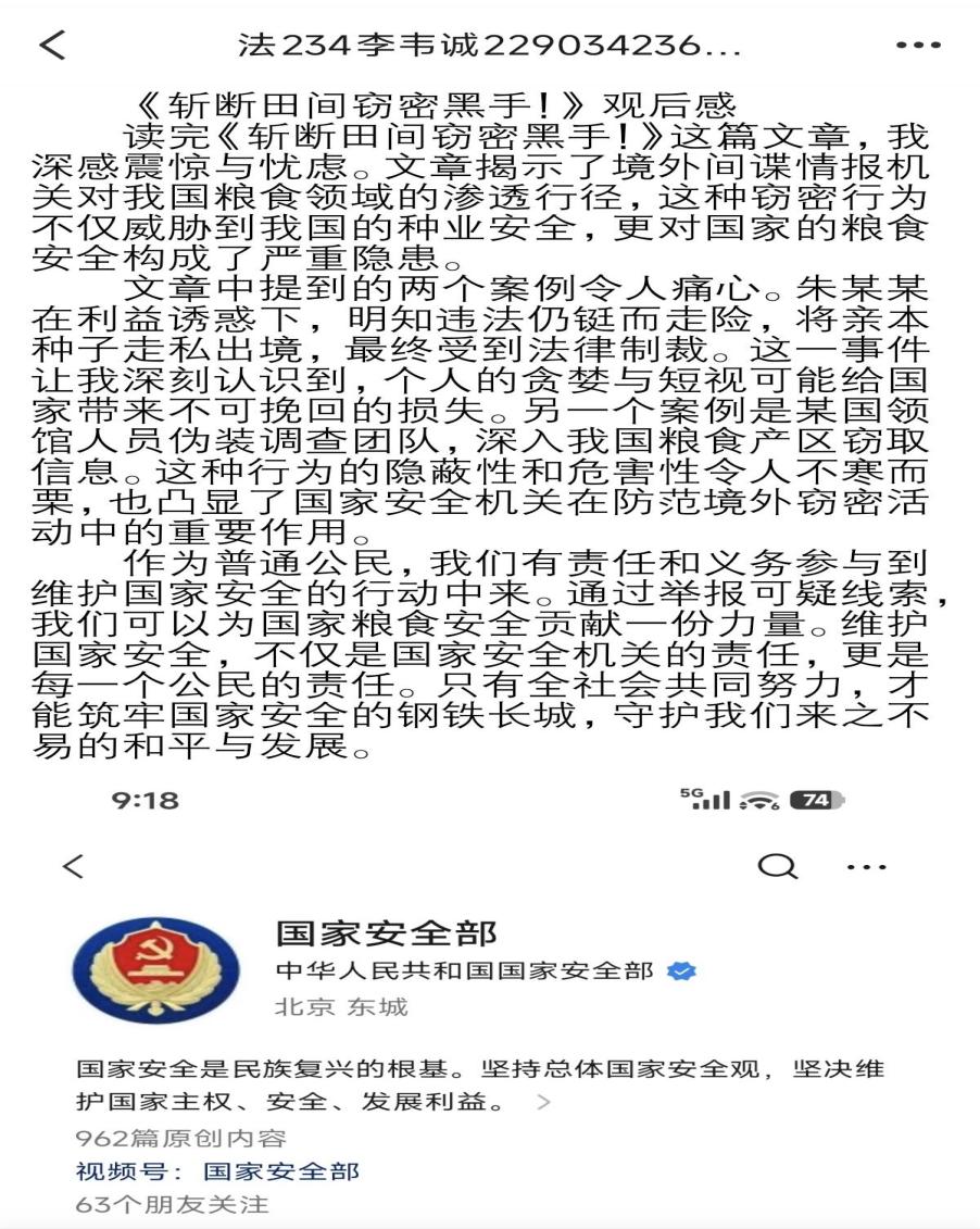 本次活动要求同学们提交电子版观后感。在观后感中,同学们围绕近期学习的国家安全相关法律法规与理论著作,结合个人思考与生活实际,分享自己的心得体会。在活动过程中,同学们或从理论层面剖析国家安全体系的构成与重要性,或结合具体案例阐述维护国家安全的现实意义,或畅谈新时代青年在守护国家安全中肩负的责任与担当。在众多观后感中,部分同学的作品脱颖而出。