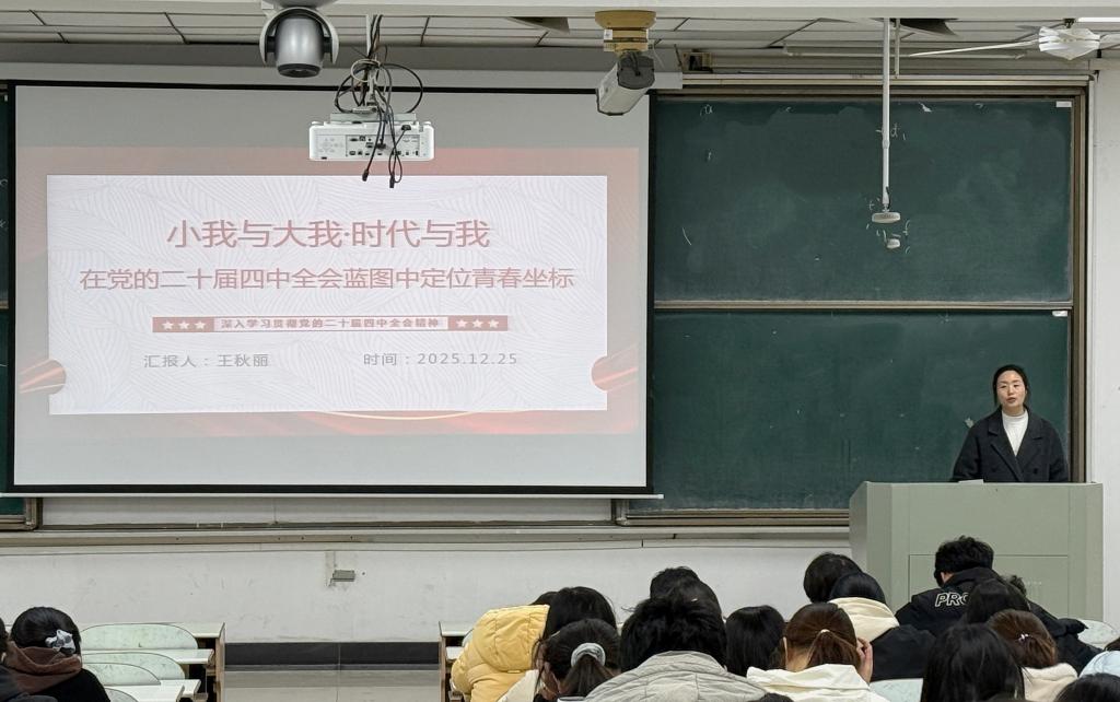 于2025年12月25日晚在教三南401教室开展“小我与大我·时代与我:在党的二十届四中全会蓝图中定位青春坐标”主题宣讲活动。理论宣讲会由辅导员王秋丽主持宣讲,2025级全体新生参加。
