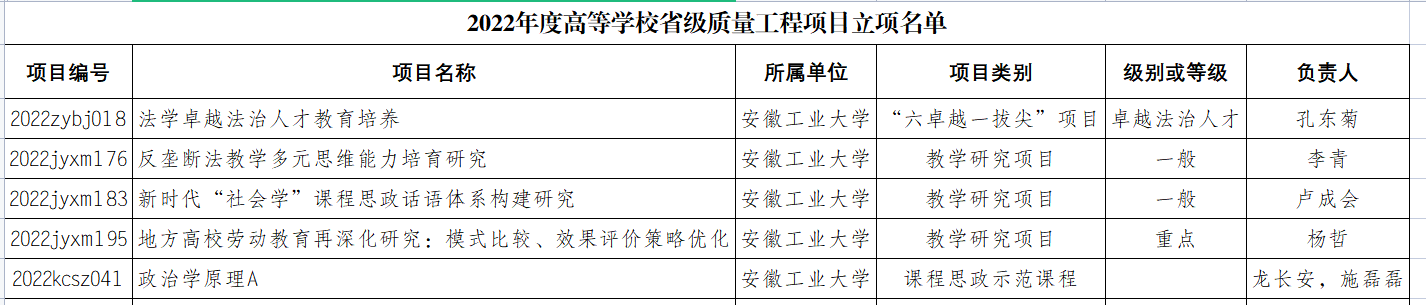 近日,安徽省教育厅公布了 2022年高等学校省级质量工程项目立项名单(皖教秘高〔2023〕56 号),91直播 共5个项目获批立项,包括“六卓越一拔尖”项目1项、课程思政示范课程1项、教学研究项目3项。