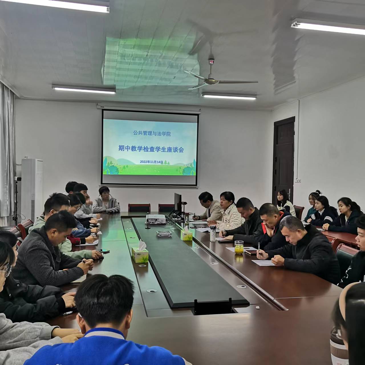 在学院会议室组织召开2022——2023学年第一学期期中教学检查学生座谈会。座谈会由教学副院长孔东菊主持,各专业系主任徐刚老师、吴鹏老师、邵宁老师、汪伟老师及教学秘书夏静老师出席,各专业各年级共32名学生代表参加了本次会议。