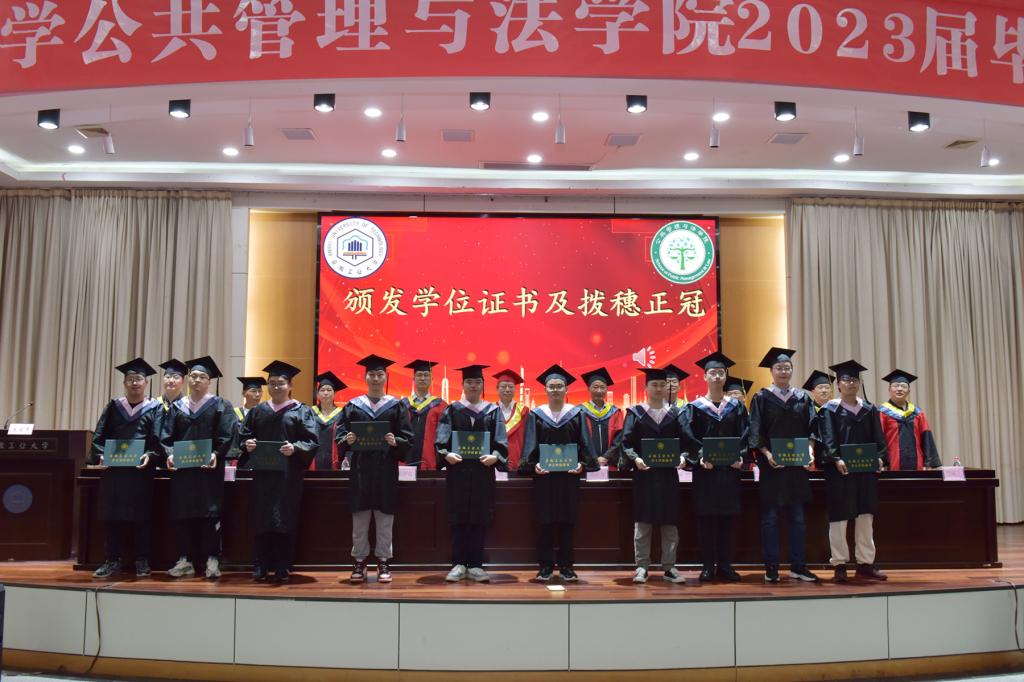 学位授予仪式上,在主席台就座的领导老师为2023届毕业生扶苏正冠,颁发毕业证书、学位证书,并合影留念。
