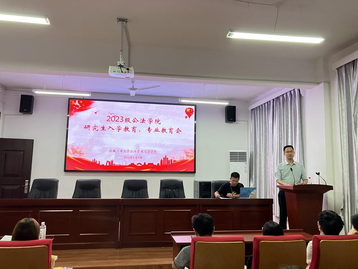 在佳山校区公法楼301举办2023级硕士研究生新生入学教育会。学院院长徐济益老师、公共管理学硕负责人王务均老师、MPA中心主任问延安老师、研究生辅导员焦芳芳老师以及2023级全体研究生新生参加活动。本次活动由学院副院长杨哲主持。