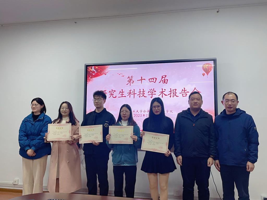 研究生科技学术报告会院级初赛主要包括三项流程。首先,由四位参赛研究生分别进行学术汇报,其次,评阅老师进行提问及专业点评,最后,评委老师根据研究生的论文水平及汇报展示情况进行综合匿名评分。四位同学分别围绕“老年人数字融入”、“青年慢就业现象”、“三产融合促进共同富裕”、“农村空巢老人居家养老需求”话题展开汇报。经大会评委评定,汪雅萍同学获研究生科技学术报告会院级初赛一等奖,丁美琪、杨文娟、李祥获研究生科技学术报告会院级初赛二等奖。现场评委老师为获奖同学颁奖并合影留念。