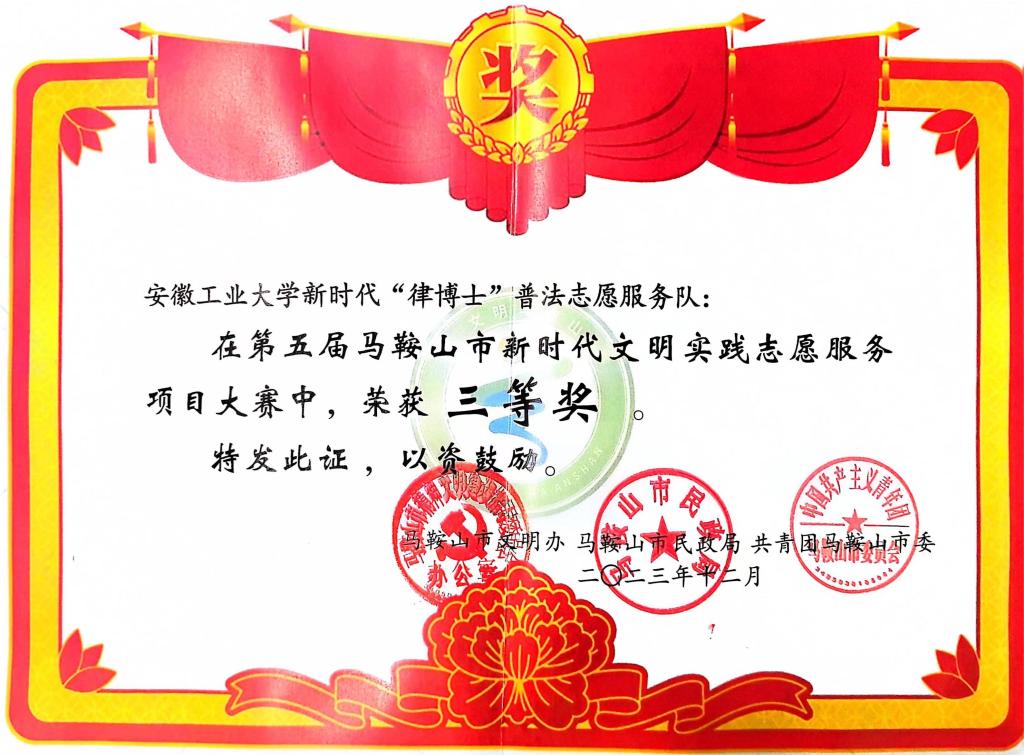 校级普法宣传平台,以青年力量进行法制宣传教育,不断增强普法宣传面及法治的渗透力,经过项目决赛角逐,“律博士”普法志愿服务队获马鞍山第五届新时代文明实践志愿服务项目大赛三等奖。