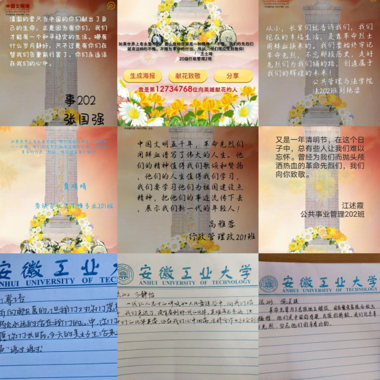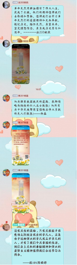 “鲜花献烈士,哀思寄忠魂”,献一束献花,抒一怀思念。在这场追根溯源的寻根之行、缅怀先烈、追思历史的“家国同构”时刻,同学们通过网络献花、线上寄语等现代文明祭祀方式悼念英烈,表达对先辈的崇高敬意。