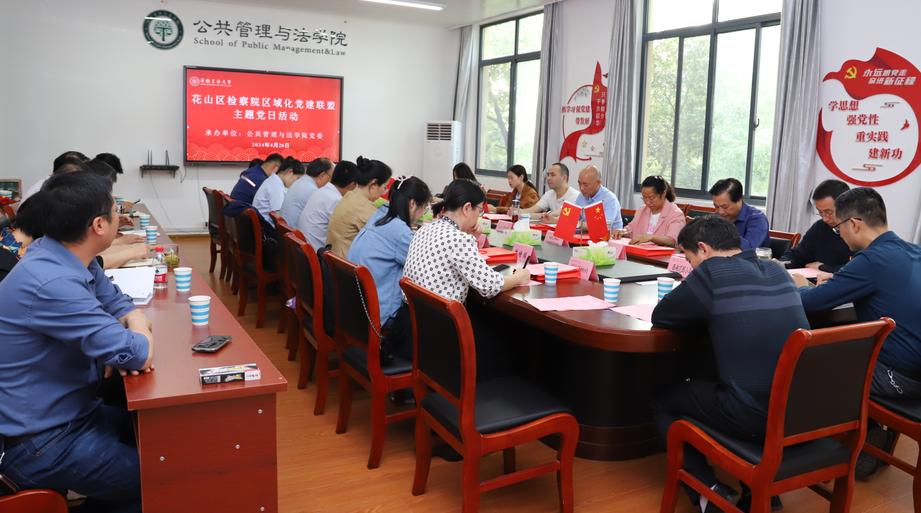 4月26日下午,由公共管理与法学院承办的花山区人民检察院区域化党建联盟“弘扬法治精神 助力依法治市”主题党日活动顺利举行。花山区人民检察院,以及联盟成员皖能发电(马鞍山)公司、市妇幼保健院、马鞍山老年医疗保健研究所、马钢股份四钢轧总厂、花山区濮塘镇濮塘村、德驭医疗马鞍山总医院、马鞍山港口集团、马鞍山软件园、西湖花园小学、市烟草局钢城分局、花山税务局等单位的党组织负责人和工作人员,安工大公法学院党委中心组成员、继续教育学院党支部党员等参加活动。