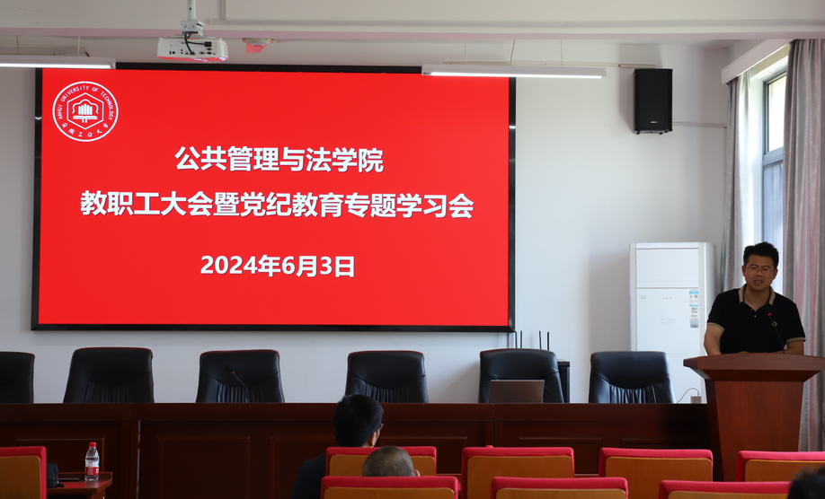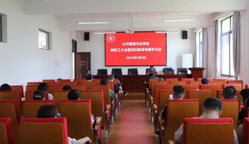 6月3日,公共管理与法学院在学院301报告厅召开教职工大会暨党纪学习教育专题会。学院党委书记胡正友主持会议,学院全体教职工、公共事业管理本科生党支部学生党员参加会议。