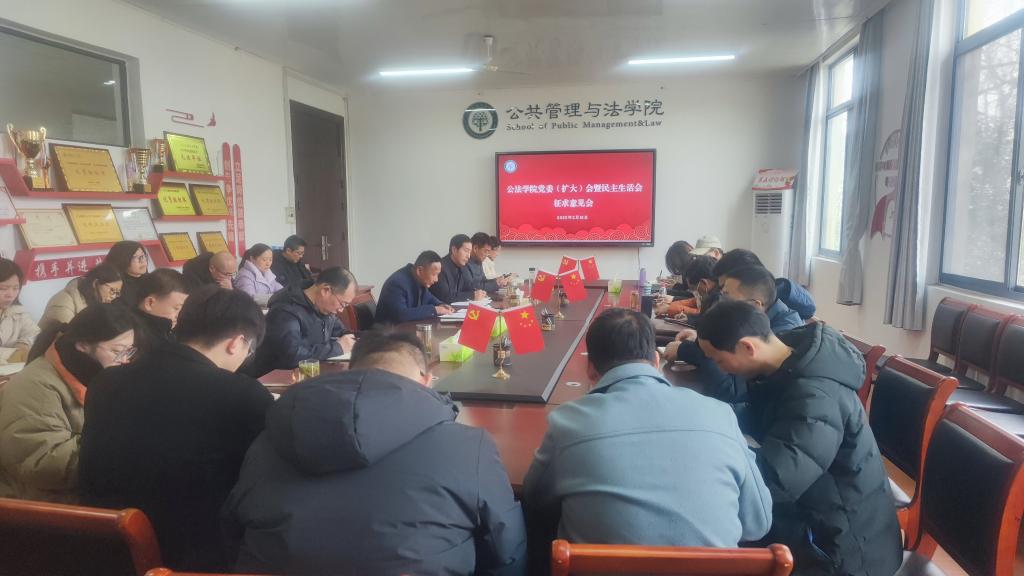 2月16日下午,公共管理与法学院召开党委(扩大)会暨学院领导班子2024年度民主生活会征求意见会,学院党委委员,学院领导,全体党支部书记、系(室、中心、创新班)负责人、科级以上干部等出席会议,学院党委书记胡正友主持会议。