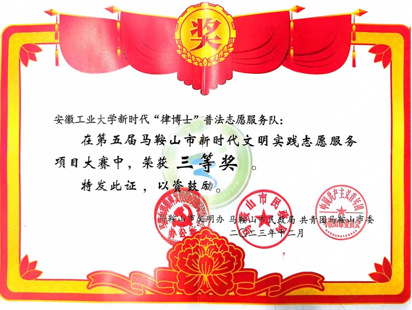 2023年12月2日,第五届马鞍山“新时代文明实践志愿服务项目大赛”颁奖仪式在马鞍山市文化馆举行。我院“律博士”普法志愿服务队获三等奖。