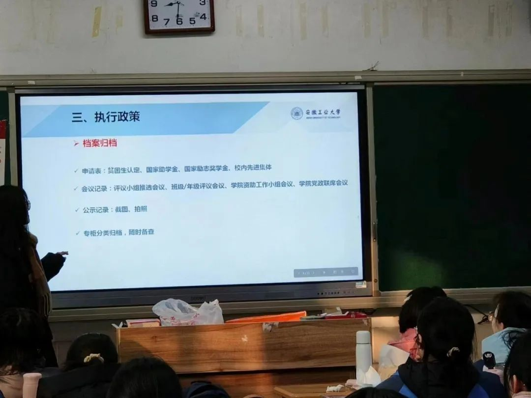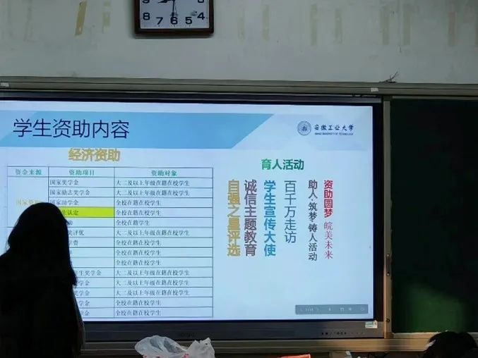 活动开始后,宣讲人先热情地向学弟学妹问好并作自我介绍。接着,围绕资金来源、资助项目、资助对象这三个部分介绍了学生资助政策内容、流程及时间节点。紧接着,有针对性地介绍安徽工业大学的资助政策体系,从国家奖学金、国家励志奖学金、国家助学金、国家助学贷款、服兵役高等学校学生国家教育资助等方面进行详细地讲解。最后,也向学弟学妹说明我校资助政策开展项目分为线上、线下两大类,除了线上开展项目外,我校还会提供勤工俭学临时岗位来帮助贫困生减轻家庭经济压力。活动结束后,宣讲人也热心与母校学子交流,分享自身经历,并鼓励学子们不要因为出身于农村就感到自卑,不要因为家庭困难就轻易放弃学业,希望他们借着资助的东风,鼓起奋斗的双翼,以进取者的姿态学习,用优异的成绩回馈社会,报效国家。