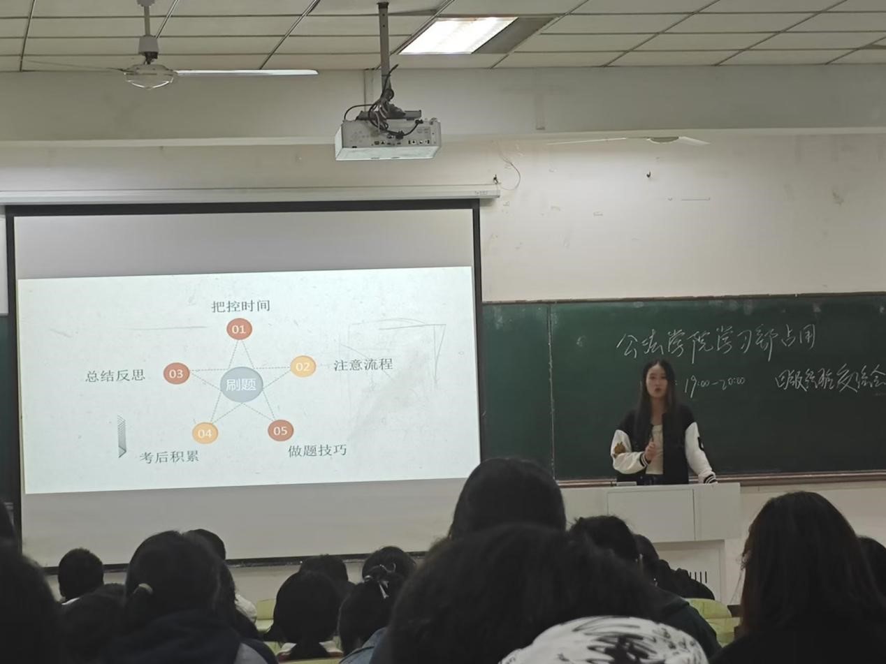 为了帮助同学们更好的准备四级考试,提高他们的英语水平,以及增强学生们应对考试的能力,公共管理与法学院学习部于11月16日晚在第三教学楼南103开展了“四级经验交流会”活动,公法学子们齐聚一堂,认真倾听了于照霖、夏筱玥、 史文晴、范潇宵等优秀公法学子们的宝贵经验分享。