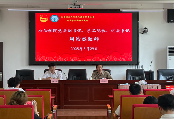 2025年5月29日,公共管理与法学院在公法楼301举行第27届团委学生会换届大会。公法学院党委副书记、学工院长、纪委书记周浩然,院团学工作负责人钱前出席,院团委学生会第26届、第27届全体部长参加会议。