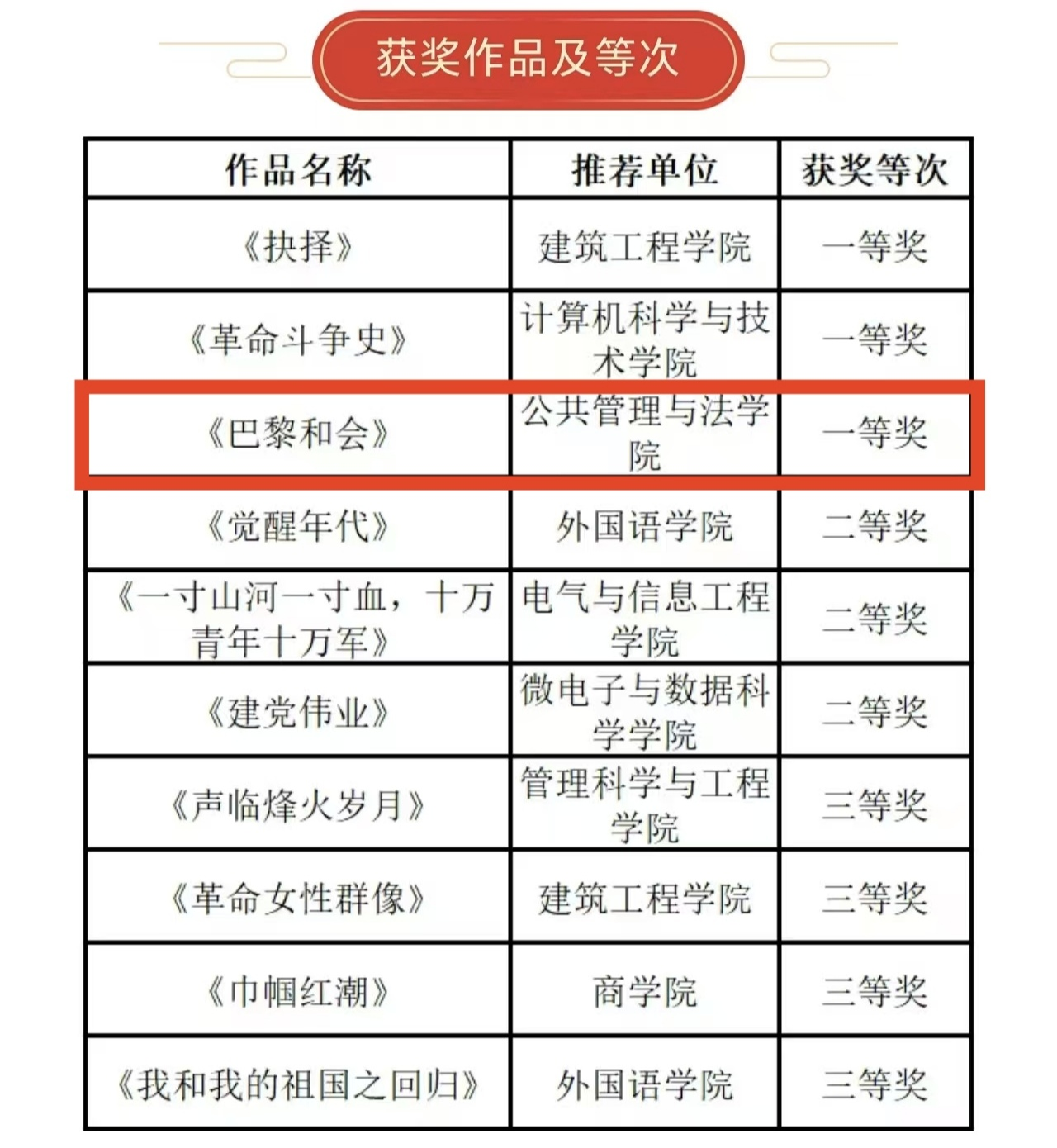 在此次活动中公共管理与法学院荣获优秀组织奖,公法学子在活动中大放异彩,作品《巴黎和会》荣获一等奖。