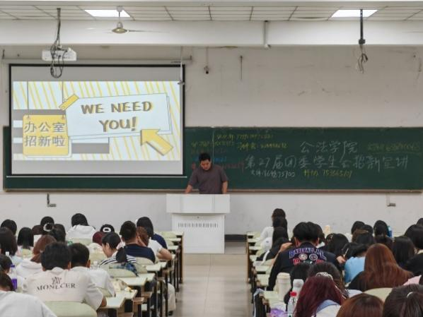 新的学期,新的征程,部门人才招募令正式启动!部门招新,既是为团队吸纳人才、优化架构以更好服务同学、推动校园文化建设,也为学生提供了实践平台,助力其提升综合能力。为实现这些目的,10月9日晚,公共管理与法学院在教三南203教室举办了2025级新生部门宣讲大会。学院各部门负责人、工作人员及全体2025级新生参加了此次宣讲活动。