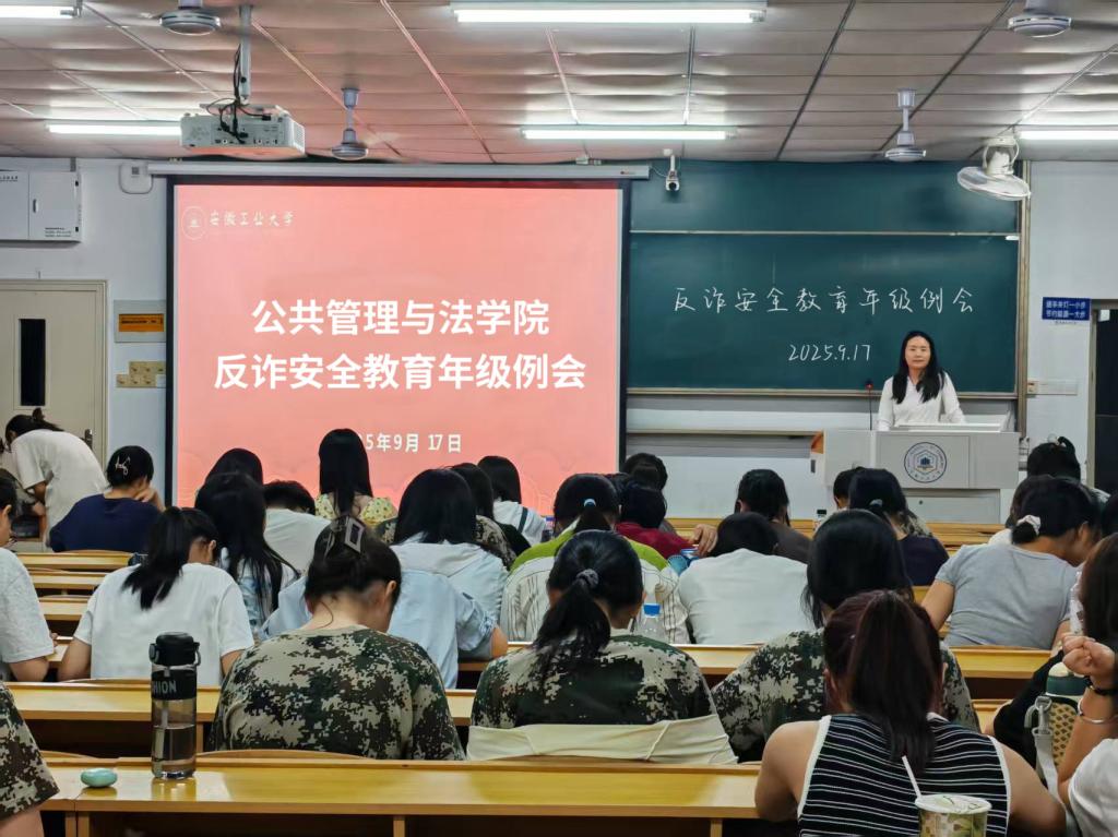 为筑牢大学生安全防护屏障,切实提升2025级新生的反诈意识与风险规避能力,响应全国校园安全专项整治行动要求,安徽工业大学公共管理与法学院于2025年9月17日,面向全体2025级新生召开反诈安全教育主题年级例会。会议由学院辅导员王秋丽主持,为新生上好入学安全“第一课”。