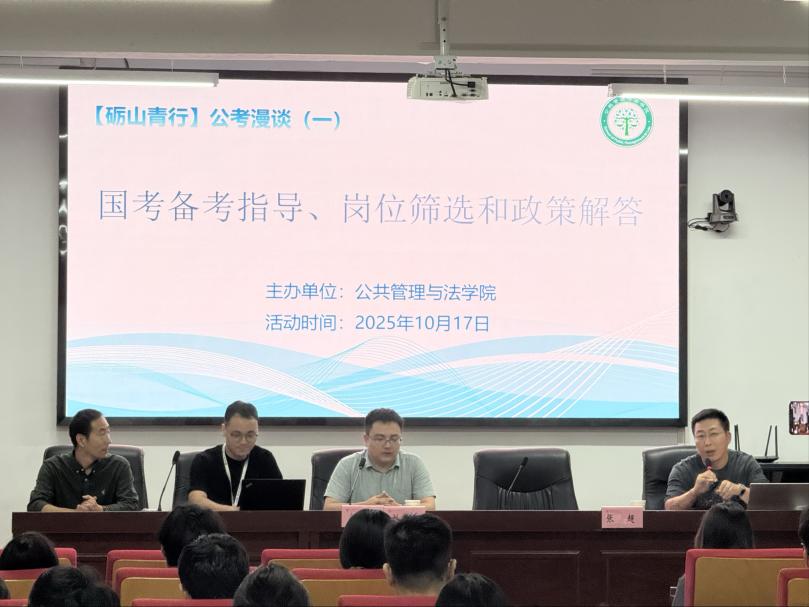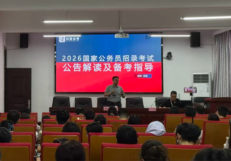 为帮助公法学子深入了解国家公务员考试、科学规划备考路径、提升就业竞争力,2025年10月17日,公共管理与法学院于佳山校区特邀“安徽兴政公考”举办国考备考宣讲会,公共管理与法学院党委副书记、纪委书记、学工副院长周浩然,辅导员产兵华,安徽兴政教育创始人刘付忠校长,安徽兴政公考机构笔试院长张超出席活动。