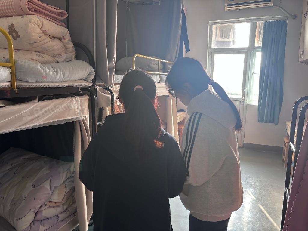 (图为工作人员进入寝室打分)
