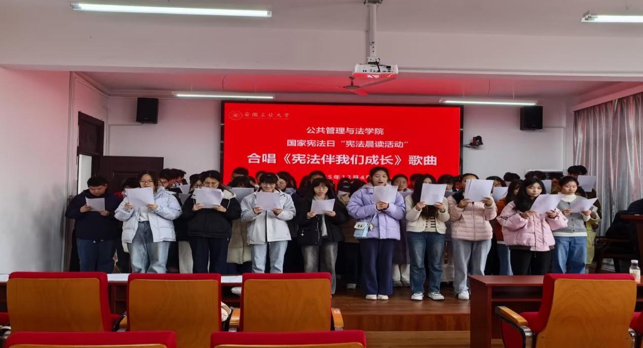 为学习贯彻习近平法治思想,聚焦宪法教育融入青少年成长全过程,着力引导青年学子树立宪法意识、增强法治观念。12月4日下午两点,公法学院在佳山校区公法楼301开展《宪法伴我们成长》歌曲传唱活动,以歌曲传唱为载体深化宪法宣传教育。公共管理与法学院党委副书记、纪委书记、学工副院长周浩然,团委书记钱前,以及2025级本科生辅导员王秋丽出席此次活动,学院各专业共计70名学生踊跃参与,一同感悟宪法精神、传递法治信仰。