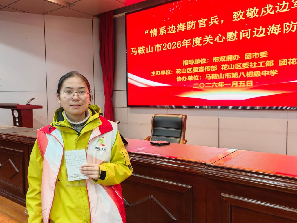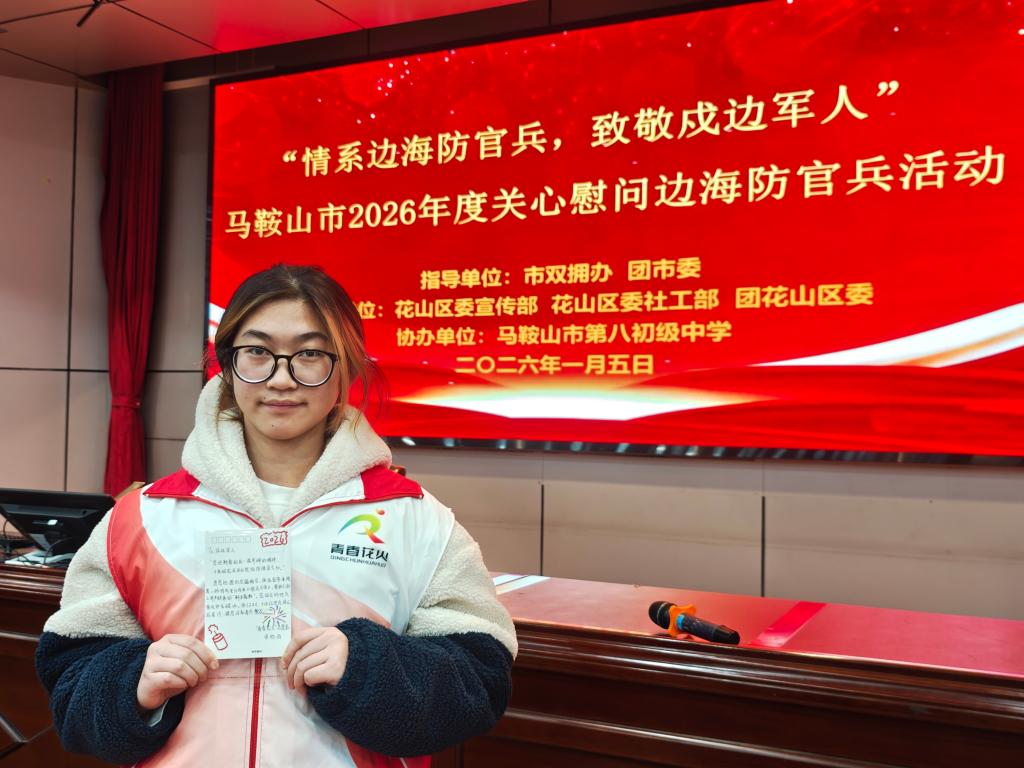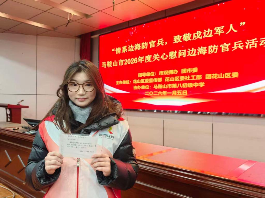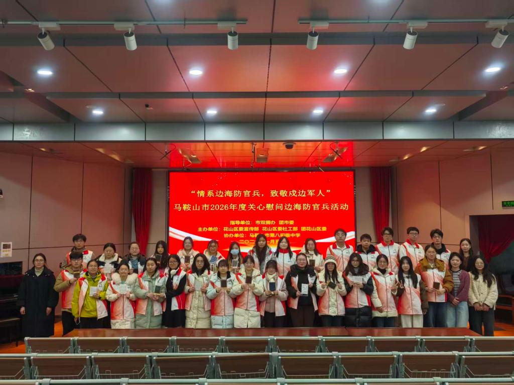 “情系边海防官兵,致敬戍边军人”主题活动于2026年1月5日在马鞍山市第八初级中学礼堂顺利举行。此次活动是马鞍山全国双拥模范城年度重要双拥共建活动,由市双拥工作办公室、共青团市委全程指导,花山区委宣传部等单位联合主办,市八中少先队员、团员代表及花山区青春花火青年志愿者代表共同参与,活动旨在深化军政军民鱼水情,传递对边海防官兵的深切关怀。
