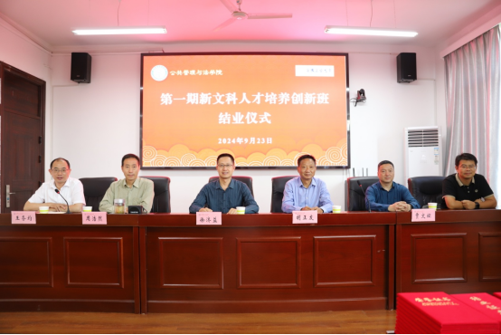 金秋九月,硕果累累,9月23日下午,公共管理与法学院第一期“新文科创新人才培养创新班”结班仪式在公法楼301报告厅隆重举行。院党委书记胡正友,院长徐济益,院党委副书记、副院长周浩然,副院长杨哲、王务均,优秀校友代表贾文坛,第一期“创新班”班主任张增国,第一期、第二期“创新班”全体学员参加结业仪式。副院长王务均主持仪式。