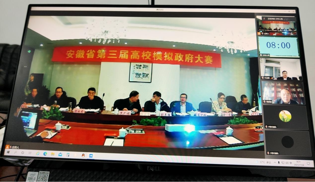 2021年11月6日,安徽省第三届高校“模拟政府”大赛决赛在线上举行,由我院行政管理系杨喜老师、劳动与社会保障系卢成会老师带队,张兆扬、朱媛媛、赵正婕、范璟靖、石子晨五名学生组成的安徽工业大学“海晏河清”代表队,以《元治理视角下脱贫攻坚与乡村振兴有效衔接路径研究——基于和县红光村的调研》为题,凭借扎实的论文功底和出色的现场表现,在论文评比和现场团队答辩环节均获得第一名的好成绩,最终荣获团队一等奖。