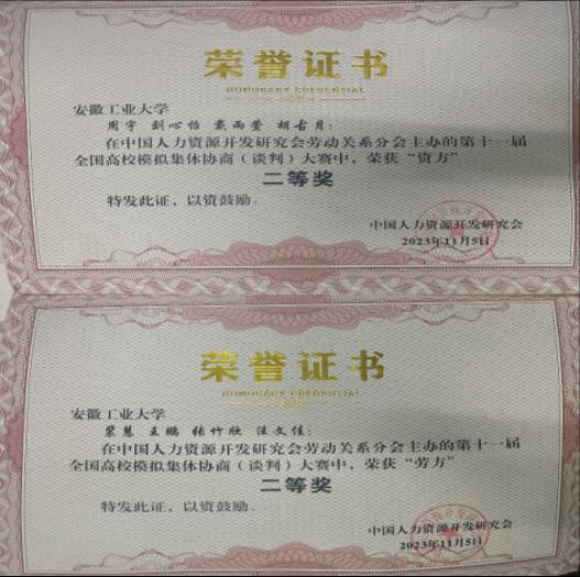 我校资方代表队(周宇、戴雨萱、胡古月、刘心怡)和劳方代表队(王鹏、裴慧、汪文佳、张竹欣)在专业教师的指导下,赛前通过实地调研、数据推演、以及多轮模拟协商演练,不断提高团队协作能力。经过初赛的激烈角逐,两支代表队均进入最终决赛,并双双获得了全国二等奖,在比赛中展现出了公法学子的胸怀天下、明理求真的卓越风采。汪伟、卢成会二位老师荣获“优秀指导老师一等奖”,戴雨萱、胡古月、裴慧、张竹欣四位同学分获四场比赛的“优秀谈判员一等奖”。